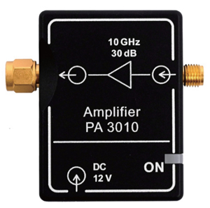 PA 3010使用SMA连接器,输入端为母头,输出端为公头,体积小:38(连接器之间)×50×14毫米。它用12V直流电供电,电流为170毫安,通过独立的电源适配器接入交流电源。
